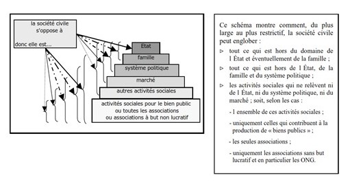 Sans rentrer dans les débats théoriques trop pointus, préciser un peu de quoi on parle est donc indispensable car, trop souvent, « ‘Société civile’ forme un lieu commun où les commodités d’un mot de passe permettent de se parler sans savoir ce que l’on dit, ce qui évite de trop se disputer » (Colas, 1992: 44, cité par Pirotte, 2007 : 5). Or, on ne peut discuter de la société civile sans prendre en compte et discuter ses rapports avec la société domestique, la société politique, l’Etat.