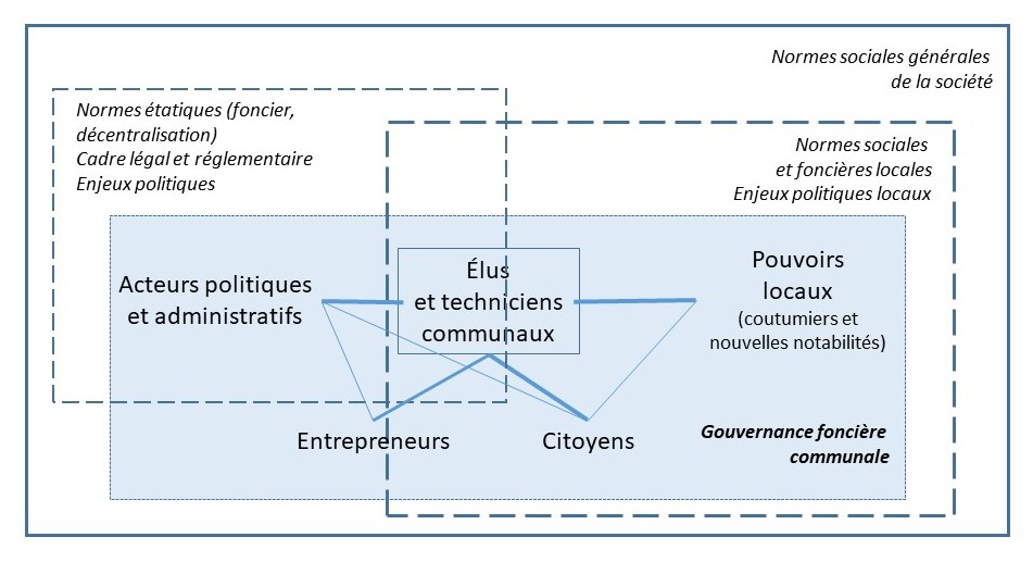 Etudier la gouvernance foncière des communes signifie ainsi pour nous analyser les pratiques des acteurs communaux (élus, techniciens) concernant le foncier, dans leurs rapports aux citoyens et aux entrepreneurs détenant des terres ou souhaitant en acquérir (figure 1) mais aussi aux autres organisations et pôles de pouvoir intervenant sur le secteur (techniciens des services de l’État, agents de l’administration territoriale ou foncière, chefs de village, etc.). Les uns et les autres sont dans des relations complexes de compétition et d’alliances, et mobilisent de façon variable des normes légales, diversement connues, adaptées, applicables, dans des contextes institutionnels diversement stabilisés. Ils jouent leur rôle officiel tout en poursuivant des stratégies personnelles. Les normes officielles (le cadre légal et réglementaire) font donc partie intégrante de l’enquête, mais comme une référence normative, diversement connue des acteurs, et diversement mobilisée et mise à distance par eux, les écarts entre normes et pratiques, et l’analyse de leurs causes, étant un révélateur des logiques des acteurs et une clé d’entrée dans les normes pratiques de la gouvernance foncière, c’est-à-dire les normes qui guident, au quotidien, les pratiques des acteurs du foncier, celles qui sont considérées comme « normales », « acceptables », quel que soit leur rapport aux normes sociales ou étatiques « officielles ».